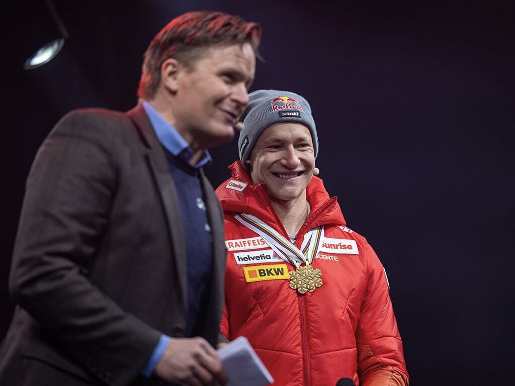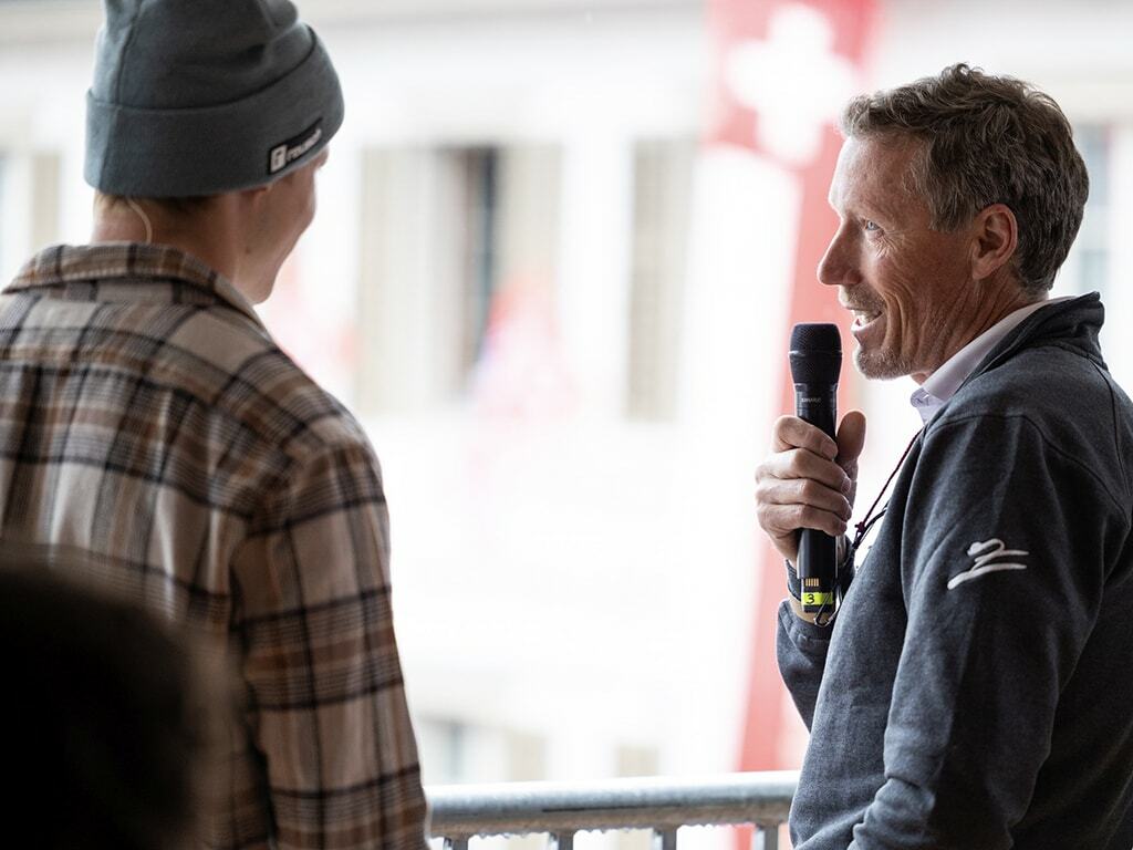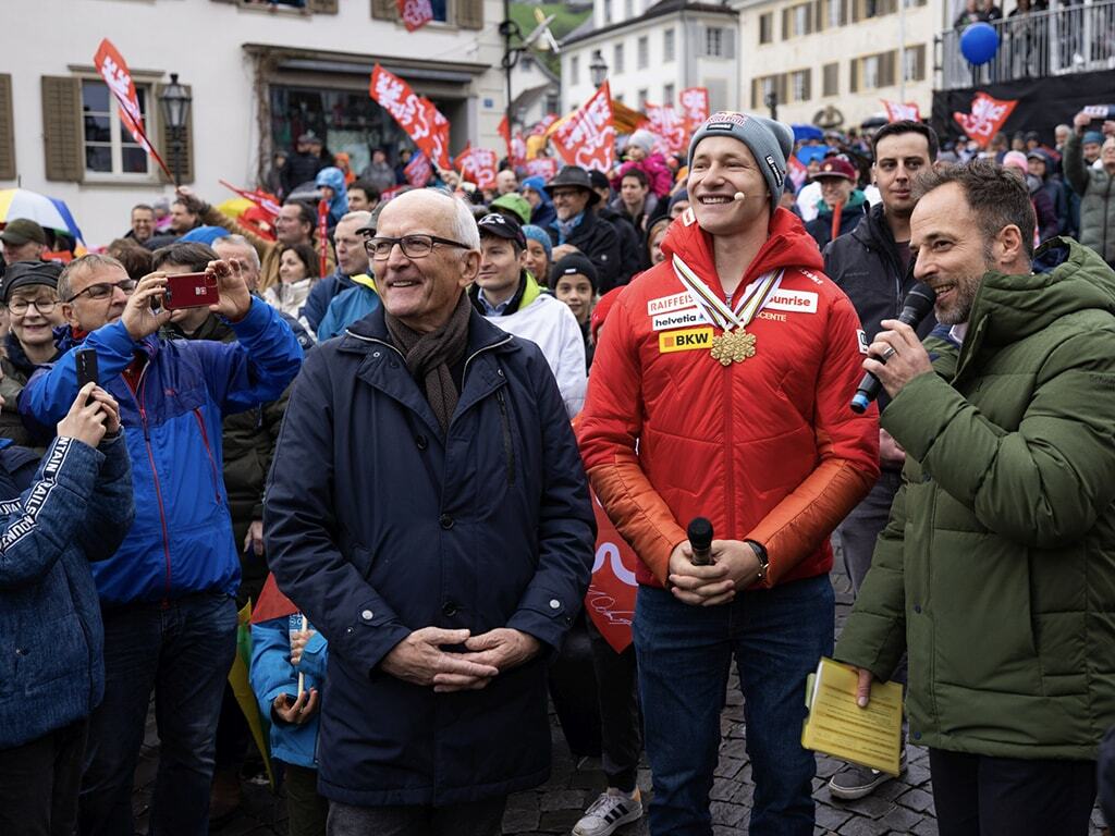 Moderator Christian Graf begrüsste das Publikum auf dem Dorfplatz in Stans und richtete aufgrund des nasskalten Wetters aufmunternde Worte an das zahlreich erschienene Publikum. Die Nidwaldner Skilegende Erika Hess wünschte Marco Odermatt vor allem Gesundheit. «Das Resultat ist wichtig, aber wichtiger ist es gesund zu bleiben und Freude zu haben.» Erika Hess hatte damals bereits mit 25 Jahren ihren Rücktritt erklärt. Sie hofft aber, dass der aktuell 25-jährige Odermatt noch lange weiterfährt. Marco Odermatt meinte, er habe noch viel Hunger nach weiteren Erfolgen.