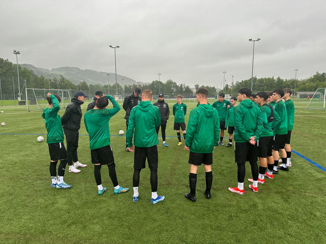 Während Marco Odermatt zum Abschluss des Tages im Training mit den Schützlingen von Nati-Coach Murat Yakin seine Ballfertigkeiten unter Beweis stellte, gab Zehnkämpfer und Weitspringer Simon Ehammer ein Athletiktraining bei den U15-Junioren. Die einen oder anderen verkürzten Muskeln waren dabei auszumachen. Spass hatten dennoch alle Beteiligten, trotz Dauerregen.